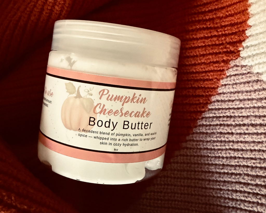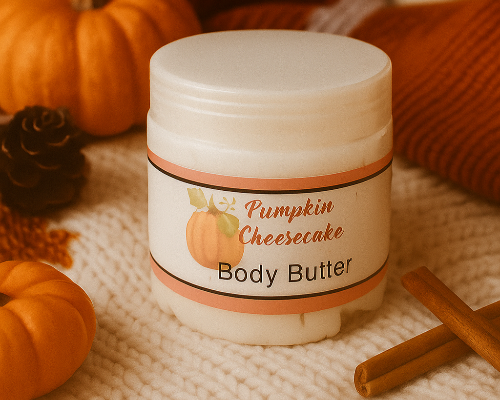 Wrap your skin in the cozy sweetness of fall. Our Pumpkin Cheesecake Body Butter is a whipped, ultra-nourishing blend that melts right in — leaving your skin soft, glowing, and deeply hydrated. Infused with rich butters and plant-based oils, this decadent treat captures the warm, spiced scent of freshly baked pumpkin cheesecake.